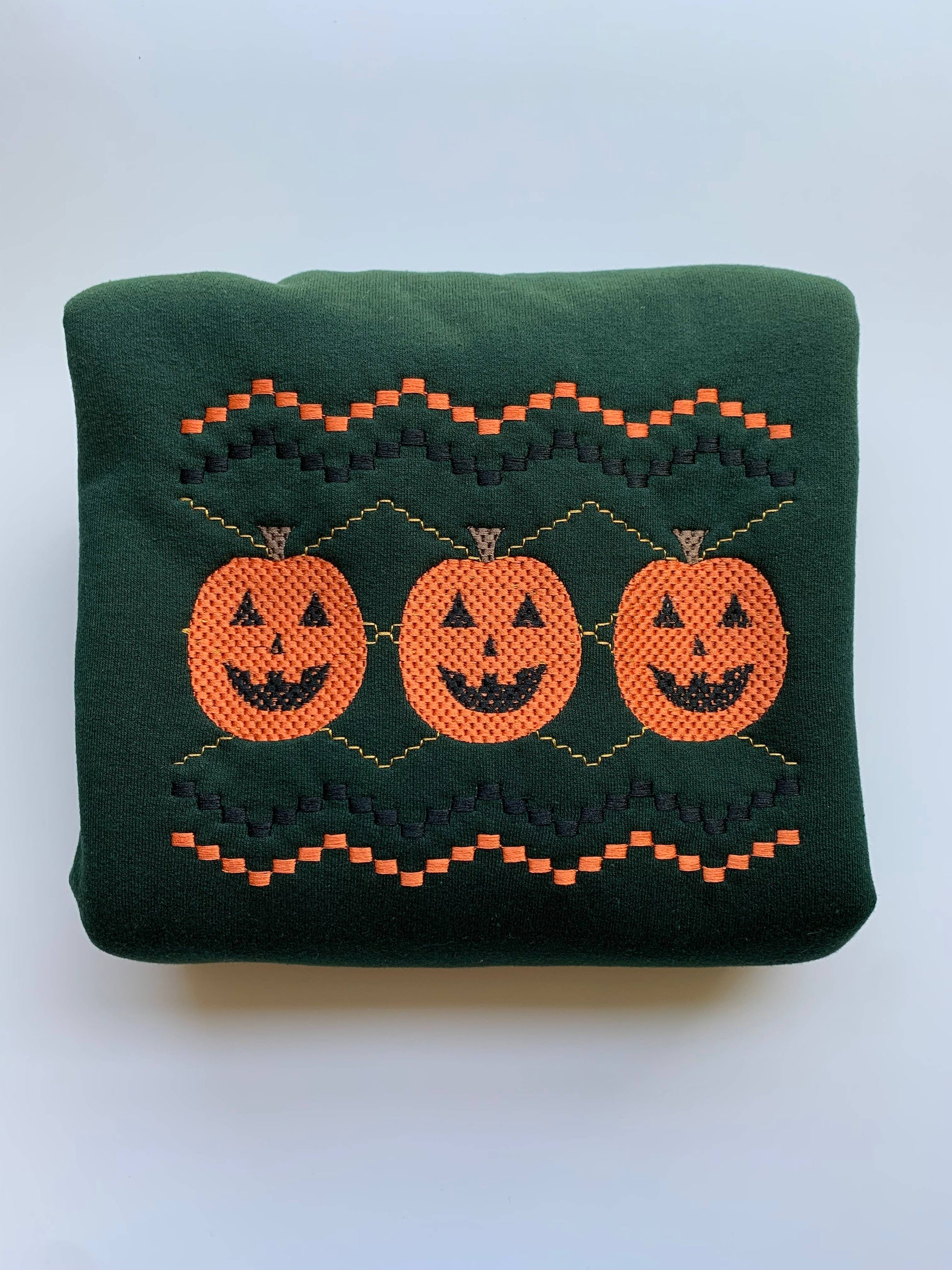 Designed in a rich Forrest green, this Pumpkin Embroidered Sweatshirt combines cozy comfort with expert craftsmanship. The detailed pumpkin embroidery adds a seasonal, artisanal touch, making it a stylish layering piece for cooler days. Crafted from soft, durable fabric, it offers warmth and lasting wearability, ideal for those seeking both comfort and distinctive fall-inspired style.